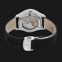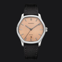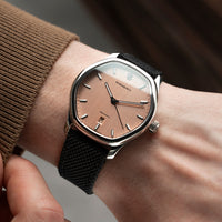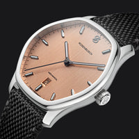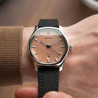 Die Horizon Copper Sun leuchtet mit der Wärme einer untergehenden Sonne über dem Wüstensand. Das Zifferblatt aus gebürstetem Kupfer strahlt Tiefe aus und wird durch Indizes und Zeiger in dunklem Grau ergänzt, die einen kühnen und doch raffinierten Kontrast bilden. In Kombination mit einem schwarzen Stoffarmband schafft dieser Zeitmesser den Spagat zwischen Lebendigkeit und Raffinesse. Angetrieben von einem Schweizer Sellita-Uhrwerk mit Handaufzug, das durch den Glasboden des Gehäuses sichtbar ist, ist sie ein eindrucksvolles Statement dynamischer Eleganz.