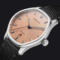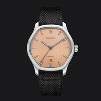 The Horizon Copper Sun glows with the warmth of a setting sun over desert sands. Its brushed copper dial radiates depth, complemented by gunmetal grey indices and hands for a bold yet refined contrast. Paired with a black fabric strap, this timepiece balances vibrancy with grounded sophistication. Powered by a Swiss hand-wound Sellita movement, visible through the exhibition case back, it stands as a striking statement of dynamic elegance.